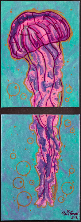 Debut at my first solo show: Pandamensional, Spring 2019. Cre8ery Gallery, Winnipeg, MB. 12" x 22", acrylic on two canvas panels, framed. 2017. Sold.