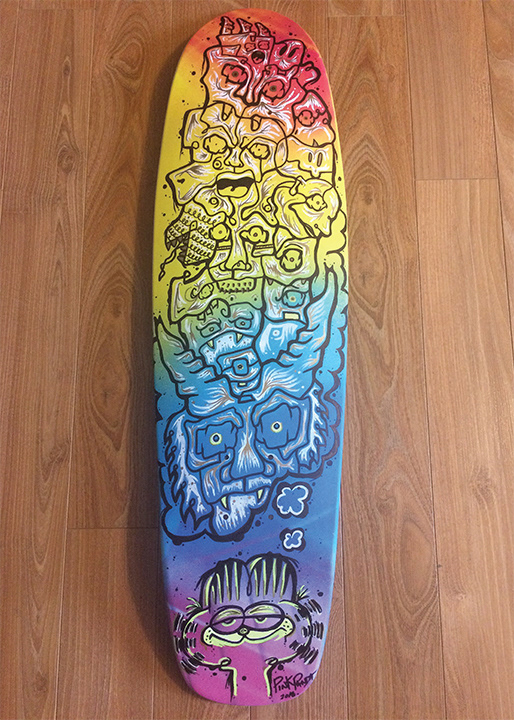 The famous orange cat combined with my monsters. Spray paint and acrylics on skate deck. 2016. Sold.